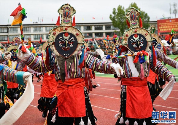 這是文化旅游節(jié)開幕式現(xiàn)場的藏戲表演(8月26日攝)。新華社記者 劉東君 攝