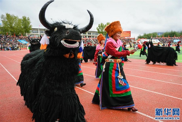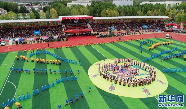 8月26日,日喀則農(nóng)牧民群眾演員身著特色民族服飾在開幕式上表演。新華社記者 劉東君 攝