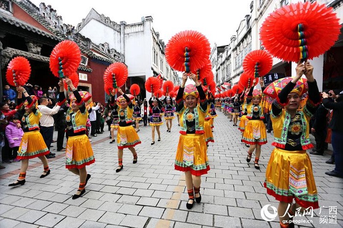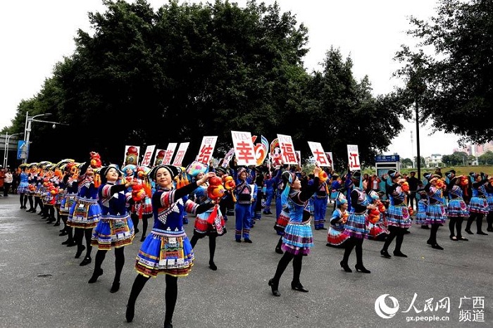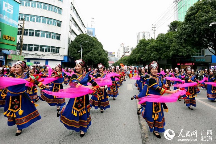 人民網(wǎng)百色12月9日電 12月9日,廣西百色市在市區(qū)舉辦“千姿百色·多彩壯鄉(xiāng)”民族文化巡游展示活動,來自該市12個縣(市、區(qū))的各族群眾載歌載舞,喜迎廣西壯族自治區(qū)成立60周年。(龐革平、陸杰)
