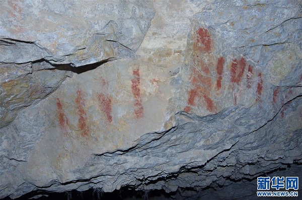 在梅龍達(dá)普洞穴遺址發(fā)現(xiàn)的巖畫(2018年8月3日攝)。新華社發(fā)