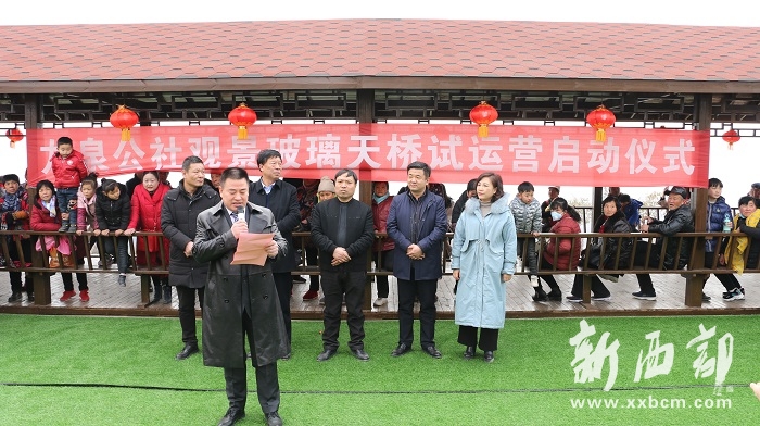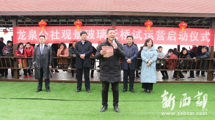 涇陽龍泉公社觀景玻璃天橋項(xiàng)目總經(jīng)理張明吉在試運(yùn)營(yíng)啟動(dòng)儀式上致辭。他說:“我們龍泉公社以黨的十八大、十九大精神為指引,按照新時(shí)代文化繁榮發(fā)展的新要求,因地制宜,立足地方特色文化,不斷豐富旅游文化內(nèi)涵,進(jìn)一步拓展旅游產(chǎn)業(yè)發(fā)展空間,做大做強(qiáng)文化旅游產(chǎn)業(yè),打造更多精品旅游景點(diǎn),目前已建成開業(yè)試運(yùn)營(yíng)的龍泉公社玻璃天橋就是其中之一,今年3月初將在玻璃天橋出口處建造400米長(zhǎng)的玻璃滑道;在玻璃天橋西側(cè)建造七彩滑道場(chǎng),這兩個(gè)項(xiàng)目于‘五·一’隆重開業(yè),在玻璃天橋西側(cè)臨坡溝壑處建造大型滑雪場(chǎng)一座,集滑雪、戲雪為一體,預(yù)計(jì)11月份開業(yè)運(yùn)營(yíng),同時(shí)年底動(dòng)工建造山地小火車??傊褪浅浞掷谬埲馁Y源優(yōu)勢(shì),給大家創(chuàng)造更多休閑娛樂場(chǎng)所,希望能給朋友們帶來更多的快樂!”