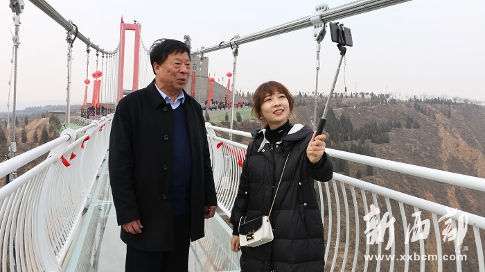 ▲涇陽縣文體廣電局、文物旅游局、電視臺(tái)、安吳鎮(zhèn)等部門負(fù)責(zé)人,龍泉公社玻璃天橋項(xiàng)目總經(jīng)理張明吉,龍?jiān)创妩h支部書記、龍泉公社董事長(zhǎng)劉煒等共同為玻璃天橋試運(yùn)營(yíng)剪彩。新西部網(wǎng) 王順利 攝影