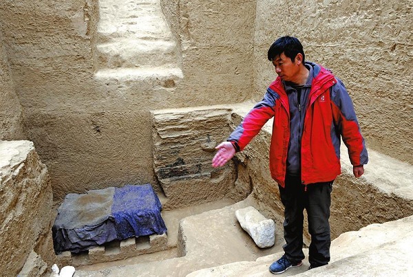 3月2日,工作人員正在介紹“中”字形大墓M2號(hào)墓。 記者 杜瑋攝