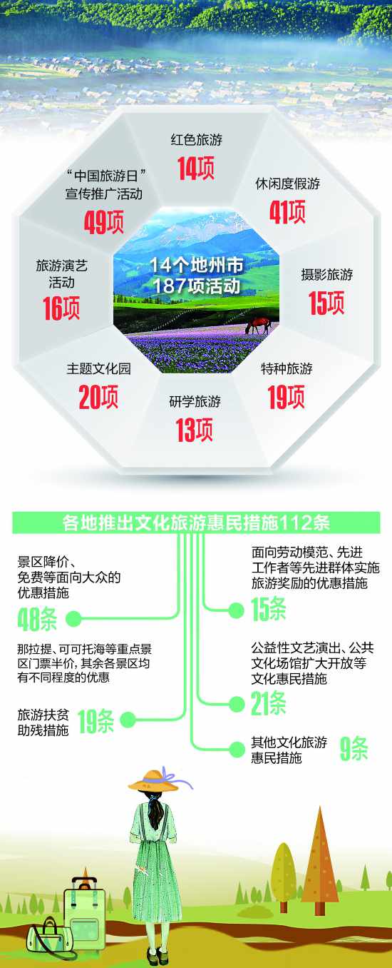 據(jù)介紹,本次“中國(guó)旅游日”新疆分會(huì)場(chǎng)活動(dòng)有三大亮點(diǎn):一是將體現(xiàn)文化和旅游融合發(fā)展。全疆各地將緊扣活動(dòng)主題組織開展文藝演出、觀賞字畫、非遺展示等多種文化和旅游融合發(fā)展活動(dòng),有效提升旅游內(nèi)涵,增加旅游多樣性,進(jìn)一步滿足群眾日益增長(zhǎng)的文化旅游需求。二是全行業(yè)全領(lǐng)域積極參與,在全行業(yè)大力倡導(dǎo)誠(chéng)信經(jīng)營(yíng)、文明出行。通過宣傳推廣公益活動(dòng),進(jìn)一步激發(fā)全民旅游熱情,營(yíng)造旅游業(yè)發(fā)展的良好環(huán)境。與此同時(shí),全疆各地州市組織舉辦各類文化旅游活動(dòng)187項(xiàng),其中紅色旅游14項(xiàng),用紅色文化旅游等活動(dòng)慶祝新中國(guó)成立70周年。推出惠民措施112條,其中景區(qū)降價(jià)、免費(fèi)等面向大眾的優(yōu)惠措施48條。全疆各地涉旅企業(yè)還推出了特價(jià)房、免門票等優(yōu)惠措施。三是以旅游活動(dòng)助力旅游扶貧工作。本次活動(dòng)將舉辦文化旅游助力扶貧資源對(duì)接會(huì)、旅游扶貧展、貧困地區(qū)開發(fā)的旅游商品展等特色展會(huì),帶動(dòng)和促進(jìn)旅游扶貧工作,助力脫貧攻堅(jiān)和文化旅游產(chǎn)業(yè)發(fā)展。