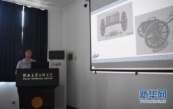 7月30日,在陜西省考古研究院涇渭基地,陜西省考古研究院副研究員黃曉娟介紹西周晚期青銅輪牙馬車復(fù)原情況。新華社記者 李一博 攝
