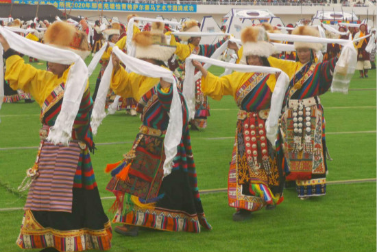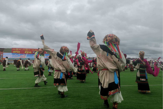 開(kāi)幕式演出中,除當(dāng)?shù)貙W(xué)生、群眾,格薩爾說(shuō)唱藝人等1144名演員外,還有260匹馬、100頭牦牛、200只綿羊參演,同時(shí)還進(jìn)行了傳統(tǒng)馬術(shù)表演,充分展現(xiàn)了藏北羌塘草原文化特色。
