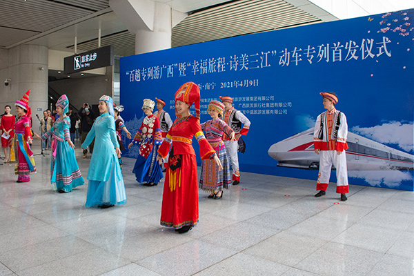 人民網(wǎng)南寧4月9日電 (沈泉池、實習(xí)生伍藝濤)為迎接2021“壯族三月三”民族傳統(tǒng)節(jié)日的到來,4月9日8時17分,隨著D8492次動車組專列從南寧東站發(fā)出,標(biāo)志著“百趟專列游廣西”“幸福旅程·詩美三江”動車專列正式啟動。