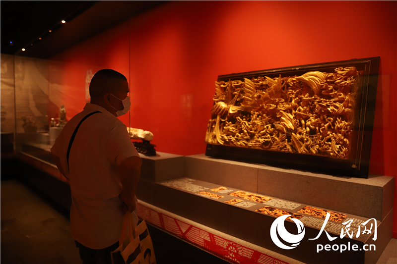 觀眾觀看汕頭金漆木雕《百萬雄師過大江》。人民網(wǎng) 馬曉楠攝