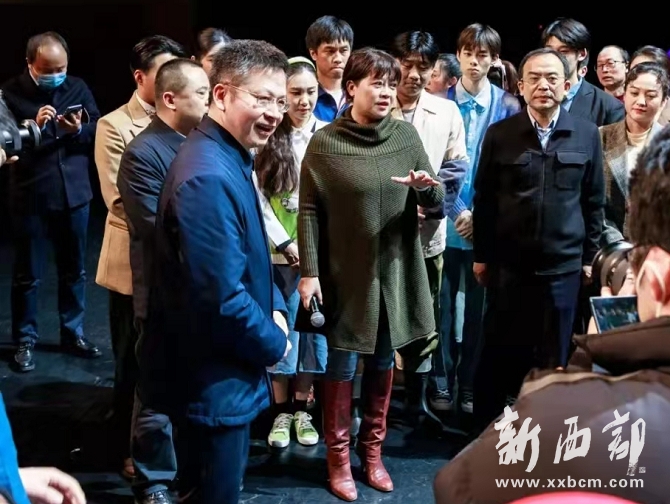 演出結(jié)束后,領(lǐng)導(dǎo)、嘉賓和專家們上臺(tái)與演職人員親切握手,合影留念,紛紛祝賀演出圓滿成功,簡短點(diǎn)評(píng)、現(xiàn)場(chǎng)交流,希望演員再接再厲,希望陜西人藝不斷推出精品力作。