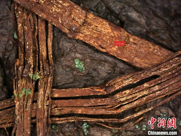 據(jù)介紹,巴文化竹編織制品是修復(fù)人員在清理一件戰(zhàn)國青銅釜甑時(shí)發(fā)現(xiàn)的,直徑殘長約12厘米,殘高3厘米,縱面顯微觀察顯示其纖維僵直、導(dǎo)管清晰、結(jié)節(jié)清楚,初步檢測鑒定編織物為竹纖維制品,具有較高的科學(xué)研究價(jià)值和文物價(jià)值。