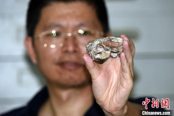 劉俊研究員展示介紹“劉氏真錢伯獸”化石標(biāo)本。 中新社記者 孫自法 攝