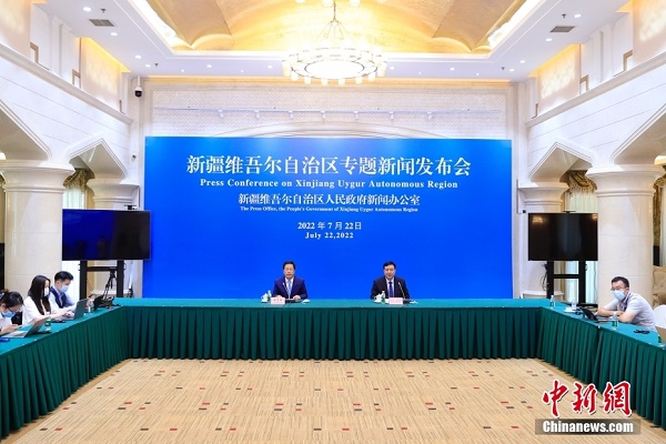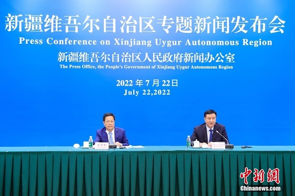 7月22日,新疆維吾爾自治區(qū)人民政府新聞發(fā)言人伊力江·阿那依提(右一)在北京就近期新疆旅游熱回應(yīng),新疆山河壯美、文化底蘊深厚、歷史遺存豐富、民族風(fēng)情濃郁,因此成為旅游熱門地。關(guān)于旅游公路——獨庫公路堵車問題,當(dāng)?shù)馗叨戎匾?,已采取多項措施保障公路正常通行?中新社記者 韓海丹 攝