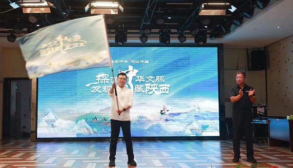 陜西省委網(wǎng)信辦網(wǎng)絡(luò)傳播處處長高志強(右)向采訪團(tuán)團(tuán)長毛嘉新授旗