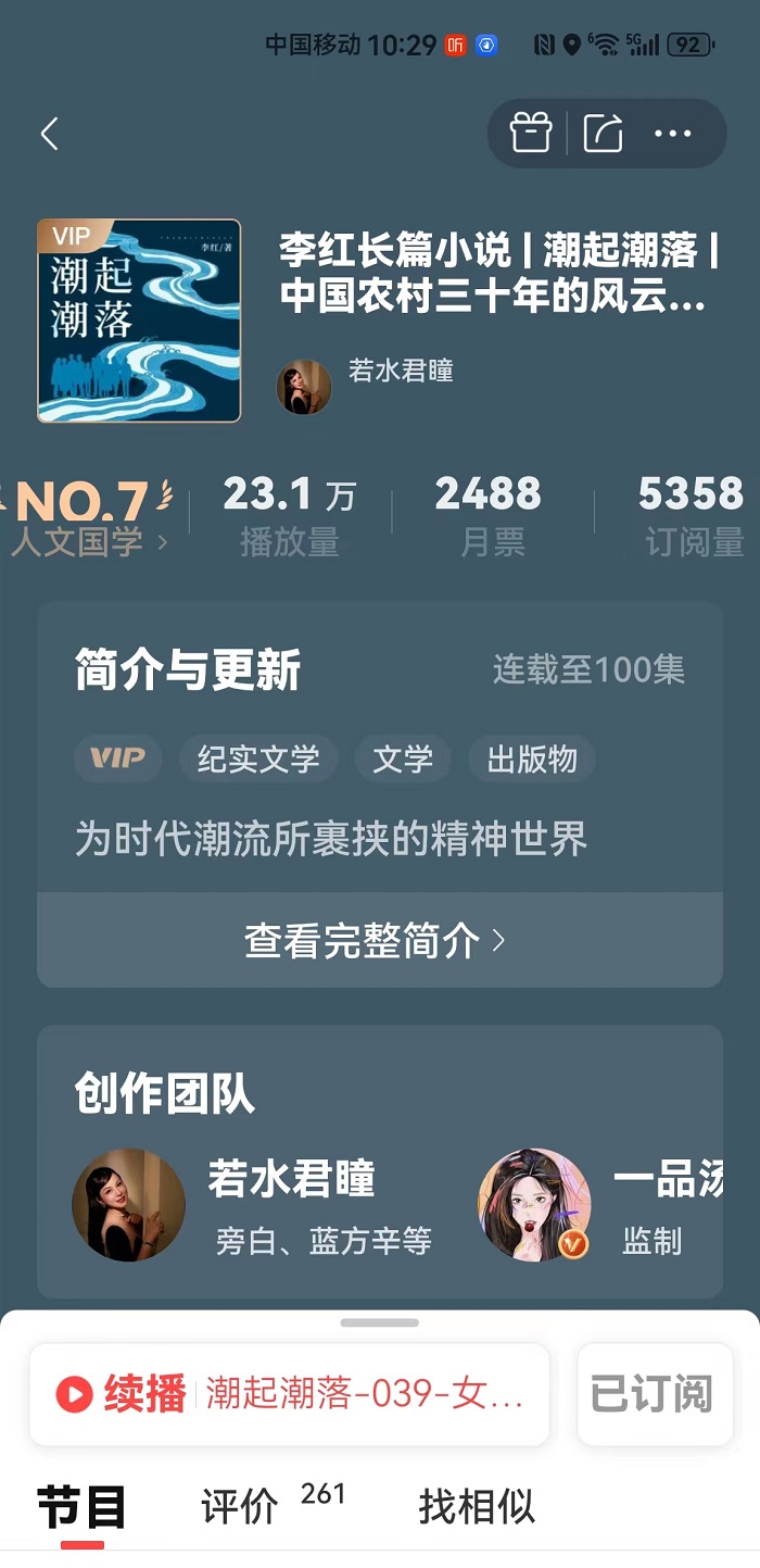 長(zhǎng)篇小說(shuō)《潮起潮落》有聲書已上架喜馬拉雅平臺(tái)。上架第三天,榮登喜馬拉雅“人文國(guó)學(xué)新品榜”17。三天后躍升第9。目前播放量已突破15萬(wàn),訂閱人數(shù)也接近5000,評(píng)論222條。評(píng)價(jià)10分。