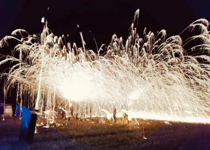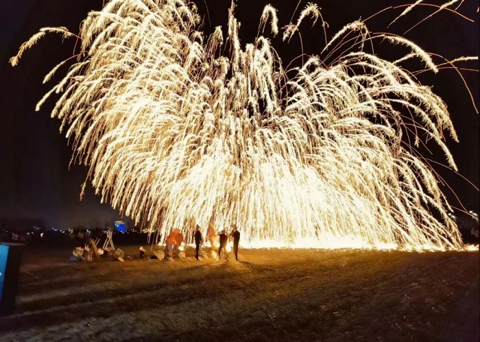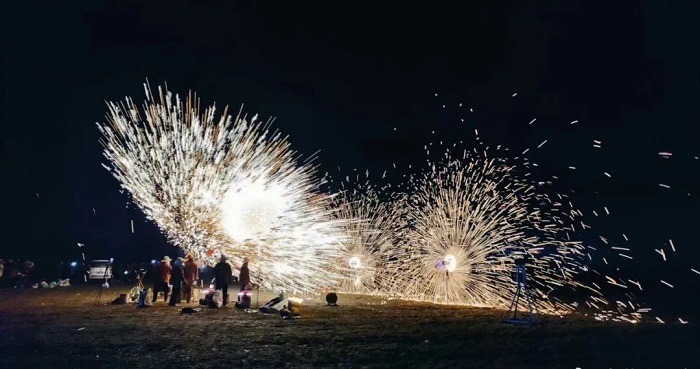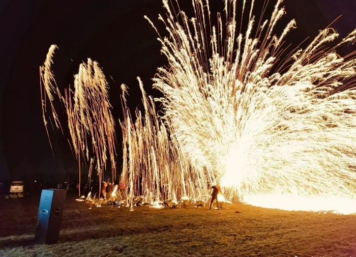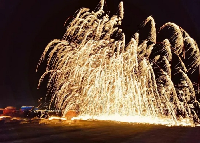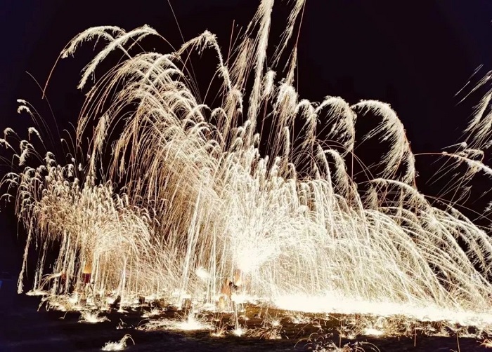 “打鐵花”是中國民間藝術(shù)中富有文化特色的非物質(zhì)文化遺產(chǎn),其技藝歷史悠久、觀賞性強。夜幕中, “打鐵花”藝人將鐵水用力舞動,奮力打向空中,濺起層層飛花,如萬點星辰在空中綻放,流光溢彩,耀眼奪目, 又如瀑布般在夜空中傾瀉而下,砸落在地面,濺起遍地銀花。