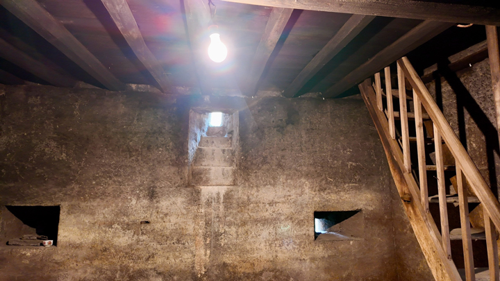 鮑家屯內(nèi)的碉樓建于清代晚期,五樓一底,主體高29米,寬6.26米,呈四方形,為石木結(jié)構(gòu),以石為主。建碉樓是為了保衛(wèi)村寨平安,四方有射擊孔,起到觀察指揮,消滅匪寇的作用,其墻體較民居墻體更厚實,不怕火攻與鑿墻。