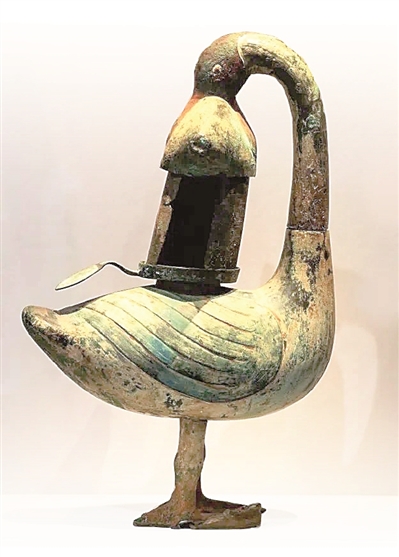 陜西歷史博物館的文物彩繪雁魚銅燈,“定格”了鴻雁回首銜魚的瞬間。造型優(yōu)美、栩栩如生的器型,由雁首頸、雁體、燈盤、燈罩套合而成,雁腹內(nèi)部裝水,燈盤中盛放燃料,燈罩由兩爿構(gòu)成,轉(zhuǎn)動(dòng)其中一爿,可調(diào)節(jié)燈光亮度。細(xì)長的雁頸和雁首,會(huì)將煙霧下沉排入雁腹的水中,起到滅煙除塵的作用。