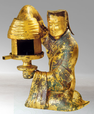 長信宮燈。1968年出土于河北保定滿城漢墓,形狀為跪地執(zhí)燈的宮女,通體鎏金。燈盤可轉(zhuǎn)動,以調(diào)節(jié)燈光亮度和照射方向,燈身人物中空的衣袖和身體作為通道用于排煙。