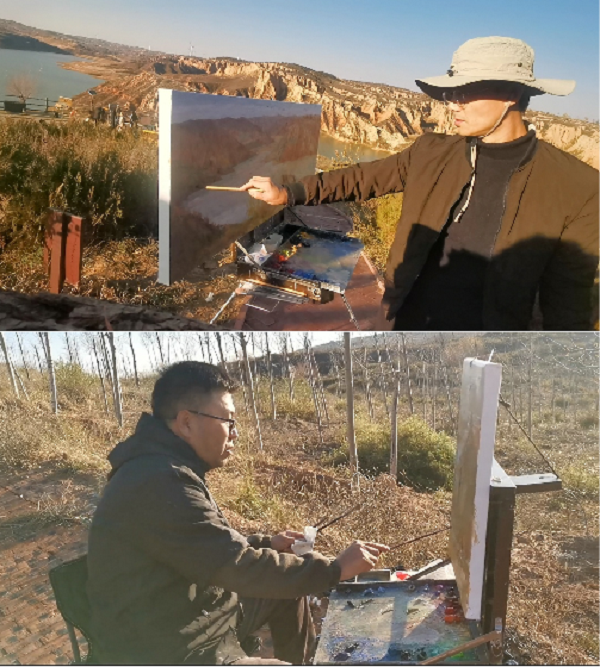 尤為幸運的是,榆林市電視臺為油畫名家郭勝利老師拍攝寫生專輯。郭勝利老師是中國美術(shù)家協(xié)會會員,陜西油畫學會常務理事,西安市美協(xié)油畫研究會副會長,西安美術(shù)學院副教授,他更是李茹主席的老師。郭老師與青年美協(xié)一起在麻黃梁房水庫開展寫生采風創(chuàng)作活動,他耐心地傳授指導:讓青年畫家們?nèi)绾斡^察周圍環(huán)境、怎樣構(gòu)圖,以及如何將眼前的景色構(gòu)成為一幅完美的畫。