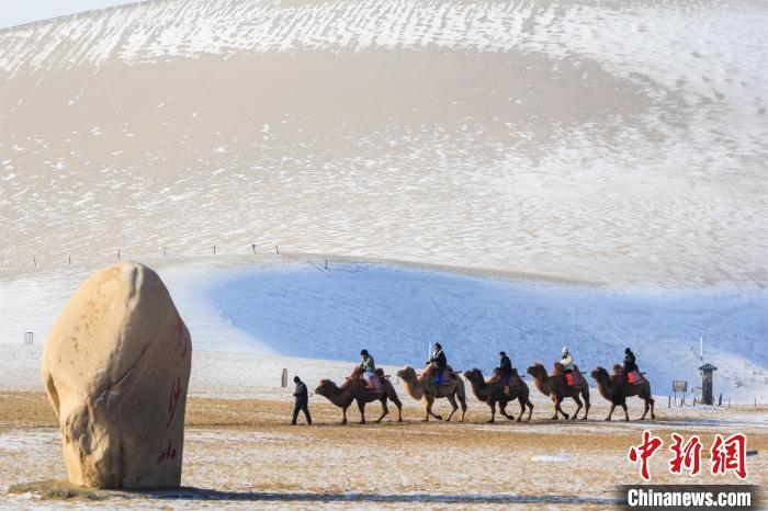 2024年12月10日,甘肅敦煌,游客騎駱駝觀賞敦煌大漠雪景。(資料圖)王斌銀 攝