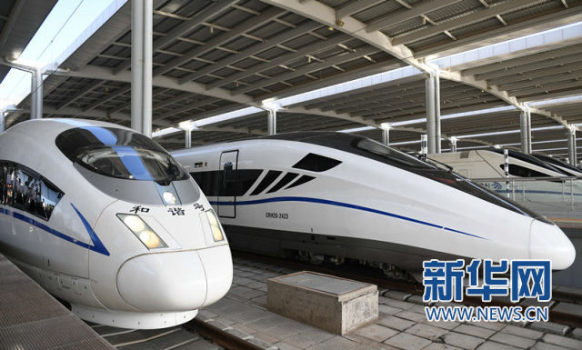 蘭州鐵路局開行的首趟寶蘭高鐵G2028次動車組(左)在蘭州西站等待發(fā)車(7月9日攝)。新華社記者 陳斌 攝