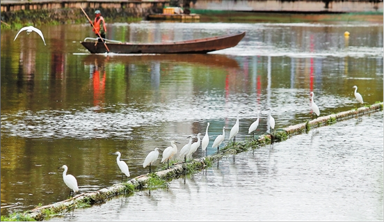 連日來,在昆明市大觀河環(huán)西橋水域,每天都有數(shù)十只白鷺在水岸邊或飛舞或歇息或捕食。隨著滇池治理的推進(jìn),入滇河道水環(huán)境得到不斷改善,吸引了越來越多的白鷺進(jìn)入昆明城區(qū)水域覓食棲息,目前在大觀河環(huán)西橋水域已聚集40多只白鷺,是歷年來數(shù)量最多的一年。圖為十余只白鷺在大觀河環(huán)西橋水域棲息覓食,成為一道美麗的景致。本報(bào)記者 楊崢 攝