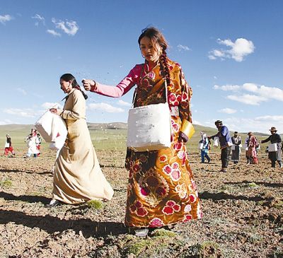 青海省玉樹(shù)藏族自治州曲麻萊縣地處三江源核心區(qū)。眼下正是青藏高原草場(chǎng)生長(zhǎng)旺季,適合生態(tài)修復(fù)。日前,當(dāng)?shù)貑?dòng)“黃河萬(wàn)里行”環(huán)??疾旎顒?dòng),并組織各族干部群眾到黃河源頭地區(qū)播撒披堿草、冷地早熟禾等草籽,為三江源增添綠色。