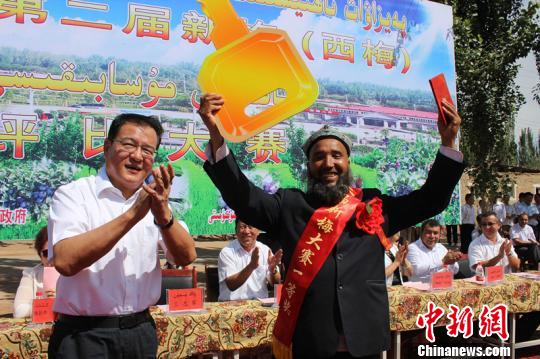8月18日,新疆伽師瓜旅游文化節(jié)期間適逢新梅(即西梅)成熟期,伽師縣委、縣政府借機舉辦第二屆新梅(西梅)評比大賽。張勝開 攝