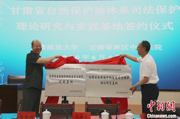 6月5日,甘肅省林區(qū)中級法院院長李景輝和甘肅政法大學副校長焦盛榮為“甘肅省自然保護地體系司法保護理論研究與實踐基地”揭牌。 崔琳 攝
