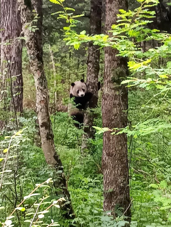 6月12日中午時分,調(diào)查人員經(jīng)過一片樹林,聽到枝葉折斷的聲響,順著響動發(fā)現(xiàn)一只大熊貓在灌木叢里活動。它也發(fā)現(xiàn)了隊員們,迅速地爬上身邊的大樹,好奇地扭頭觀望。