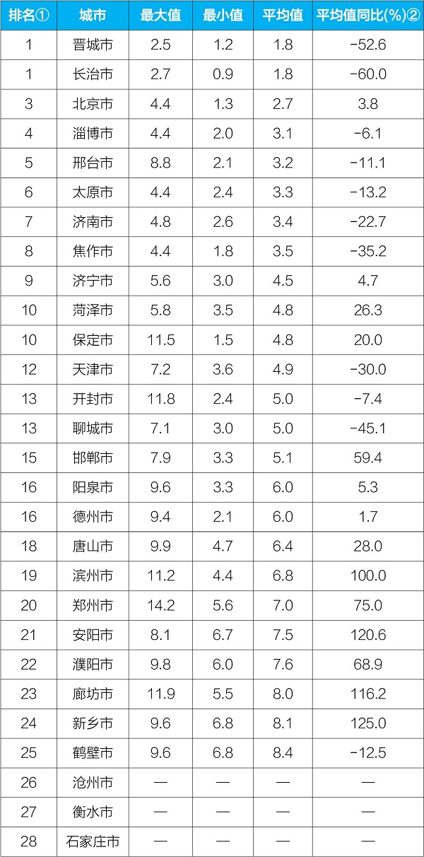 注:①按2020年12月“2+26”城市降塵量平均值從小到大進行排名。下表同。