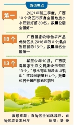 近年來,在“綠水青山就是金山銀山”發(fā)展理念指引下,廣西落實(shí)生態(tài)文明建設(shè)政治責(zé)任,推動生態(tài)文明建設(shè)示范區(qū)創(chuàng)建工作高歌猛進(jìn)。截至今年10月,廣西獲得國家生態(tài)文明建設(shè)示范區(qū)、“綠水青山就是金山銀山”實(shí)踐創(chuàng)新基地授牌命名的市(縣、區(qū))分別達(dá)到13個和4個,數(shù)量位居全國西部地區(qū)前列。