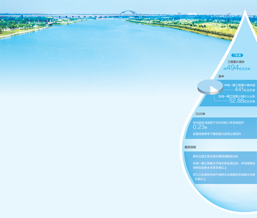 清水長流,北方地區(qū)水資源短缺局面得以有效緩解。目前,北京市城區(qū)七成以上供水為“南水”,天津市主城區(qū)供水幾乎全部為“南水”,山東形成了“T”字型水網……南水北調的水成為北方40多座大中城市主力水源。