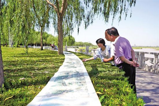 吳忠市水務(wù)局的工作人員(中)向記者展示黃河寧夏河道影像長(zhǎng)卷。