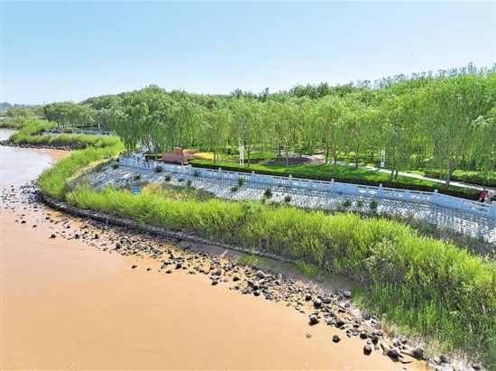 藍(lán)天下的黃河金岸,草木葳蕤,綠樹成蔭,呈現(xiàn)出一幅美麗和諧的生態(tài)畫卷。