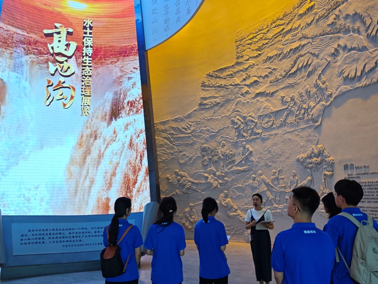 實(shí)踐團(tuán)隊(duì)首先來(lái)到高西溝生態(tài)治理展館參觀學(xué)習(xí)。自20世紀(jì)50年代起,高西溝村開(kāi)始探索治理水土流失的方法,如今,全村林草覆蓋率目前已達(dá)70%。成員們紛紛贊嘆高西溝村水土保持與生態(tài)建設(shè)的偉大成就,對(duì)高西溝人“為有犧牲多壯志,誓把山河重安排”的膽識(shí)氣魄深感敬佩。