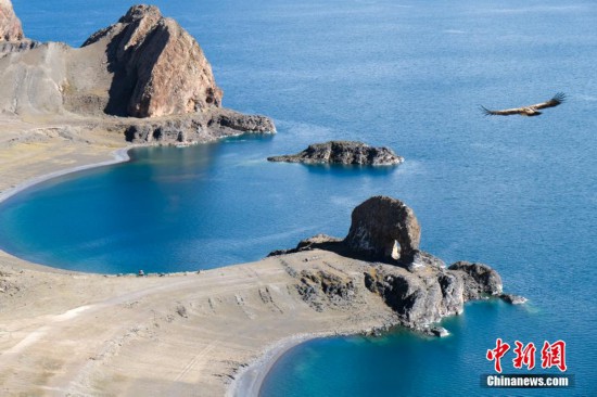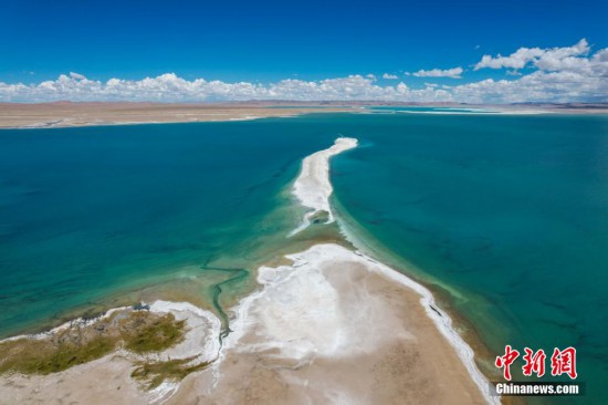 國慶期間,中新網(wǎng)記者自駕西藏藏北羌塘草原,途經(jīng)“天湖”納木錯(cuò),高原鹽湖班戈湖以及西藏第一大湖色林錯(cuò)等地。秋天高原藍(lán)天白云的映襯下,藏北湖泊猶如一面面巨大的“寶石藍(lán)”鏡子鑲嵌于高原大地,景色壯麗。圖為10月2日,航拍西藏第一大湖色林錯(cuò)北岸風(fēng)光。記者 江飛波 攝