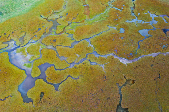 ??這是2022年9月17日在甘肅省甘南藏族自治州瑪曲縣拍攝的黃河上游重要水源涵養(yǎng)地阿萬倉濕地內(nèi)的一處沼澤景觀。占地562萬畝的瑪曲濕地是世界上保存最完整的濕地之一,被譽(yù)為“黃河之腎”(無人機(jī)照片)。新華社記者 郎兵兵 攝
