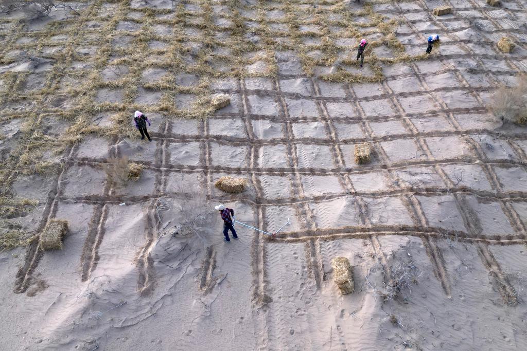 人勤春早。從烏鞘嶺到星星峽,千里河西走廊上,廣大干部、群眾向沙漠進(jìn)軍,用麥草方格織出“格子衫”,為沙漠“鎖邊”。“河西走廊—塔克拉瑪干沙漠邊緣阻擊戰(zhàn)”的沖鋒號已經(jīng)吹響。
