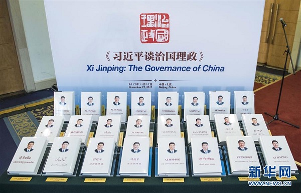 11月27日,16個國家的知名出版機(jī)構(gòu)同中國外文局外文出版社在北京簽署《習(xí)近平談治國理政》第二卷國際合作翻譯出版?zhèn)渫?,共同翻譯出版這些國家語種版本的《習(xí)近平談治國理政》第二卷。這是在簽約儀式上拍攝的《習(xí)近平談治國理政》多語種版本圖書。新華社記者李濤攝