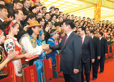演出開始前,習(xí)近平等黨和國(guó)家領(lǐng)導(dǎo)人會(huì)見了各民族演職人員代表,同他們親切握手并合影留念。