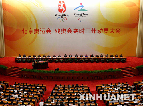 2008年7月9日,北京奧運(yùn)會(huì)、殘奧會(huì)賽時(shí)工作動(dòng)員大會(huì)在北京人民大會(huì)堂舉行。圖為大會(huì)會(huì)場(chǎng)。新華社記者 羅曉光 攝