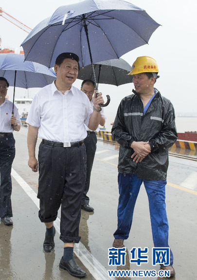2013年7月21日至23日,習(xí)近平在湖北調(diào)研全面深化改革問題和當(dāng)前經(jīng)濟(jì)運(yùn)行情況。 這是7月21日上午,習(xí)近平冒雨來到武漢新港陽邏集裝箱港區(qū)考察。 新華社記者 李學(xué)仁 攝