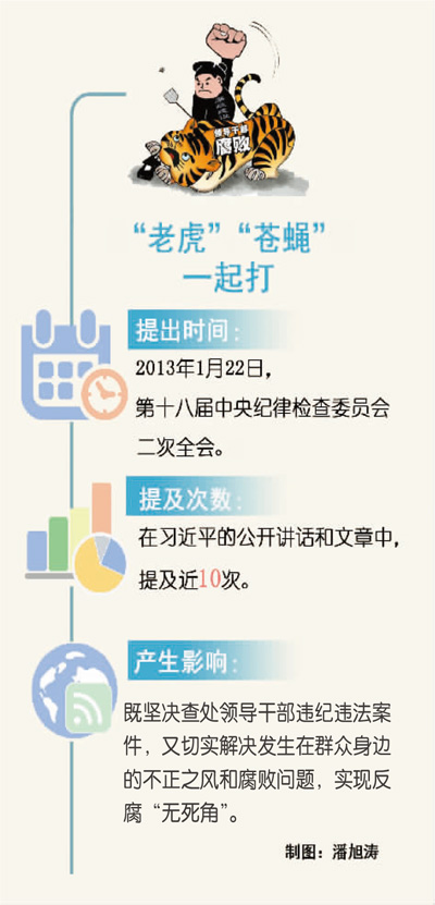 “‘老虎’‘蒼蠅’一起打”,就是堅持有腐必反、有貪必肅,堅持黨紀國法面前沒有例外,實現(xiàn)懲治腐敗“無死角”。