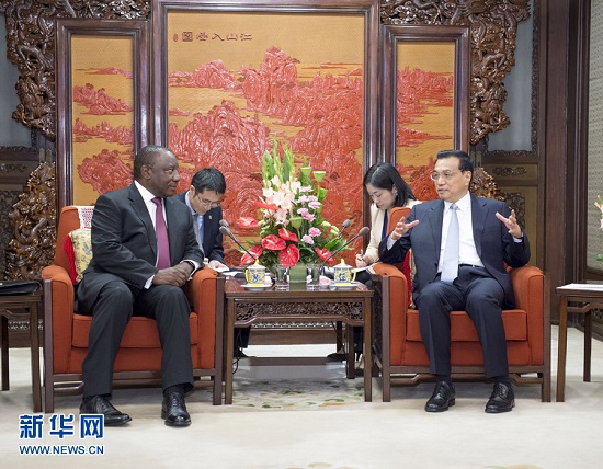 新華網(wǎng)北京7月14日電 國務(wù)院總理李克強(qiáng)14日下午在中南海紫光閣會(huì)見南非副總統(tǒng)拉馬福薩。