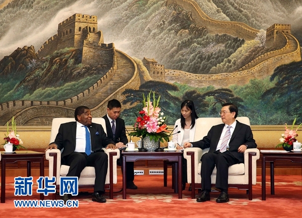 全國人大常委會委員長張德江2日在人民大會堂會見各國議會聯(lián)盟秘書長純貢。