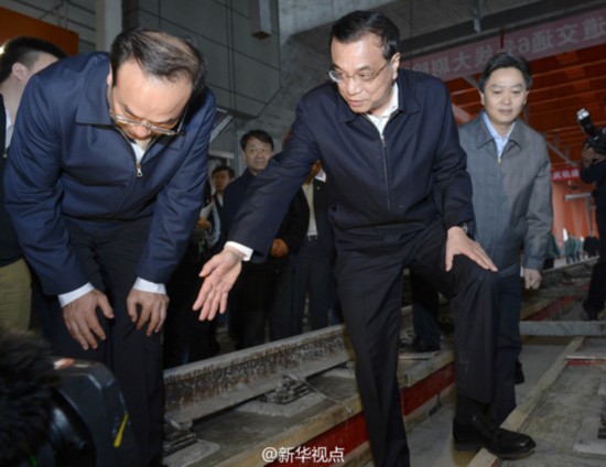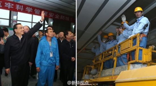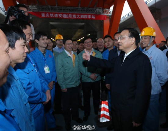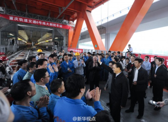 五一勞動節(jié)將至,李克強(qiáng)總理在重慶輕軌六號線大劇院站施工現(xiàn)場看望建筑工人。他三次停下腳步,向圍攏而來的工人說:“你們在這里辛勤工作為重慶市民出行提供方便。五一節(jié)快到了,我向每個(gè)勞動者致以節(jié)日快樂!”他還不時(shí)提醒站在軌道機(jī)車上施工的工人注意安全。