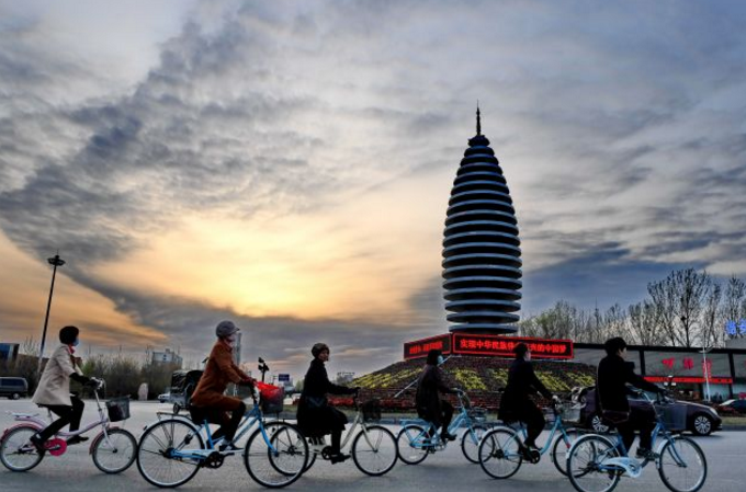 市民在河北雄安新區(qū)容城縣縣城道路上騎行(3月29日攝)。新華社記者 牟宇 攝