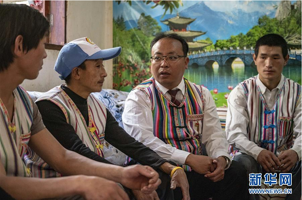 4月12日,云南省貢山縣獨龍江鄉(xiāng)黨委書記余金成(右二)在村民家中宣講學習習近平總書記回信。新華社記者 江文耀 攝