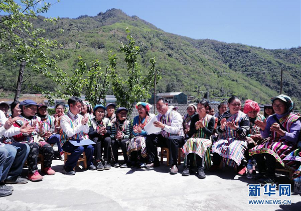 4月11日,云南省貢山縣獨龍江鄉(xiāng)干部群眾一同宣讀學習習近平總書記的回信。 新華社發(fā)(謝宇 攝)